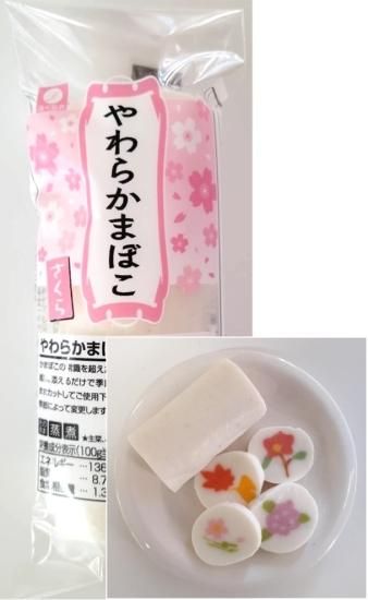 春(さくら):魚肉(輸入)、液卵白、大豆油、砂糖、食塩/加工デンプン、グリシン、調味料(アミノ酸等)、着色料(クチナシ、ウコン、紅麹、コチニール、カロチノイド)、増粘剤(グァー)、pH調整剤、乳化剤、硫酸アルミニウムアンモニウム